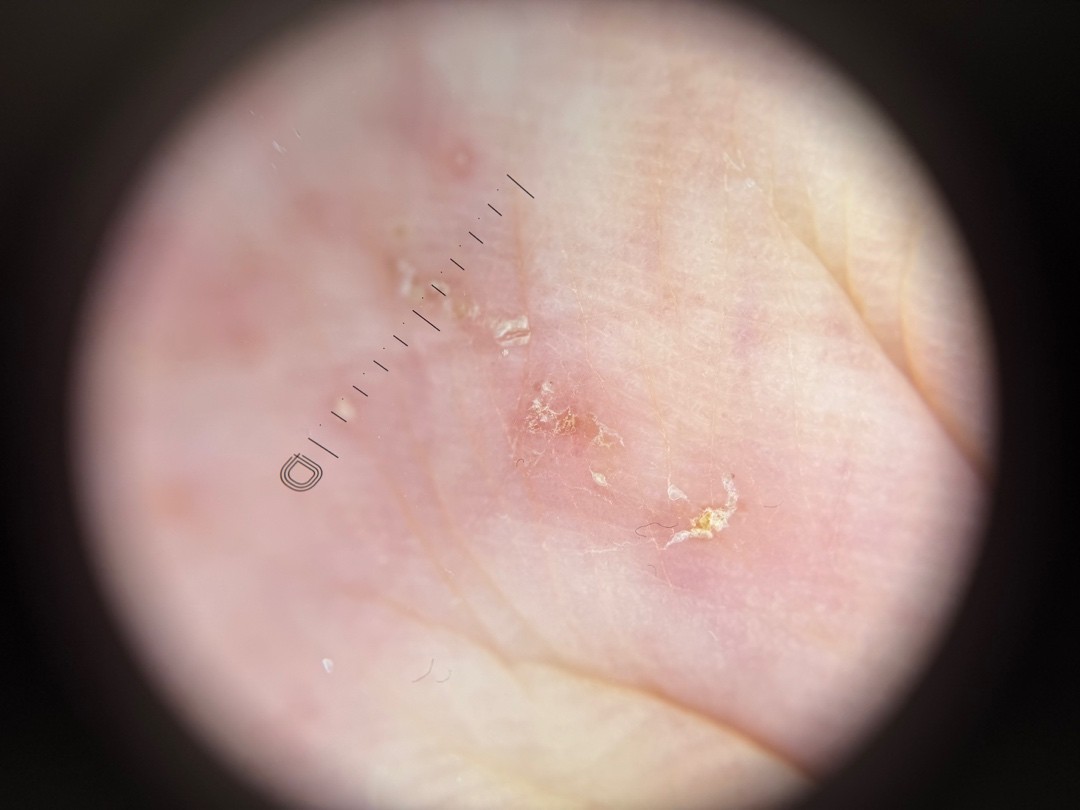 An 86-year-old man, a resident of an old age home, presented with generalised pruritic rash over his trunk and bilateral upper and lower limbs for over one year. His previous treatments include 2 courses of topical permethrin 5% lotion and intermittent topical corticosteroids, with minimal sustained improvement. On examination, the forearms and dorsum of hands showed ill-defined erythematous patches with excoriations. A characteristic sign was noted over his right thenar eminence, which became more conspicuous on dermoscopic examination.