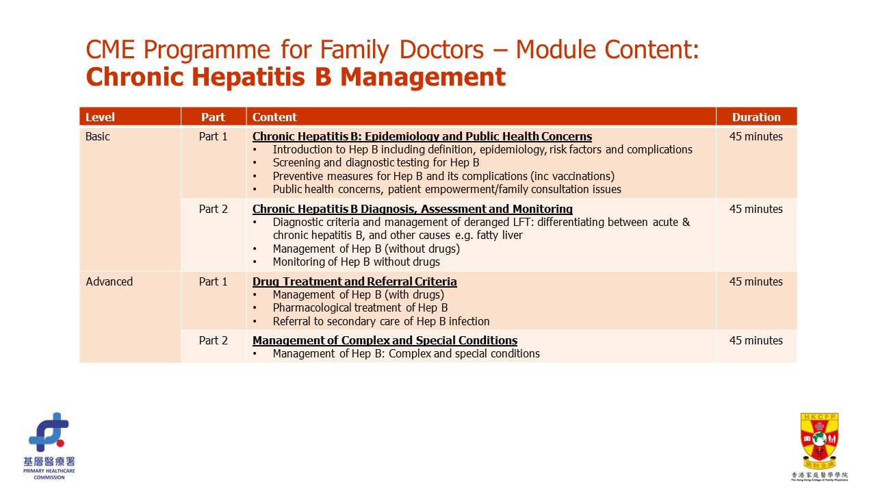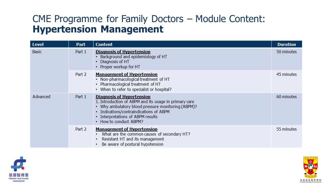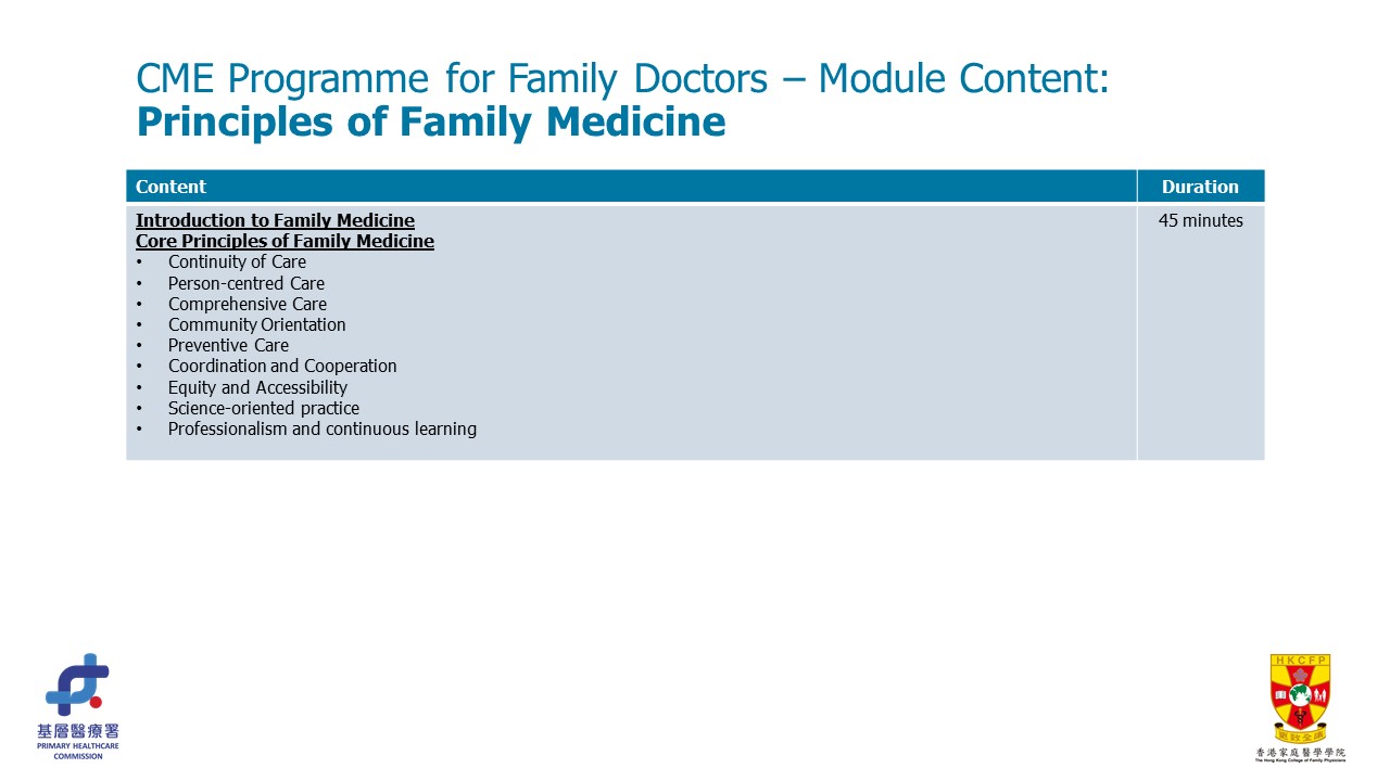 In alignment with the recommendations outlined in the Primary Healthcare Blueprint to enhance primary healthcare-related training for healthcare professionals and promotion of a multidisciplinary approach, the Primary Healthcare Commission of the Health Bureau commissioned the Hong Kong College of Family Physicians to organise the CME Programme for Family Doctors.