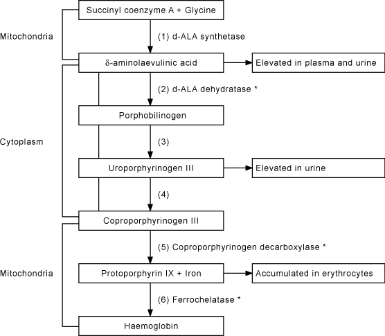Figure 1: Site of action of lead poisoning on haemoglobin biosynthesis Asterisk (*) indicates those enzymes blocked by lead.