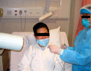 PPE) taking the sample (on the patient's left). (Photograph used here,