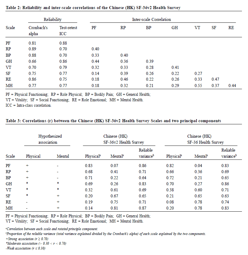 結論:中文(香港)SF-36v2健康調查是可靠和可信的,可準確