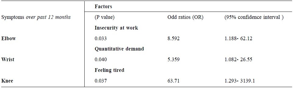 Results: Using the Nordic Questionnaire, the 12 months prevalence of symptoms of neck, shoulder, wrist, upper and lower back were 69.1%, 53.1%, 44.1%, 48.5% and 48.5% respectively. Job insecurity (OR=8.592, 95% CI 1.188-62.12, p=0.033), quantitative demand (OR=5.359, 95% CI 1.082- 26.55, p=0.040) and feeling tired (OR=63.71, 95% CI 1.293- 3139.1, p=0.037) were significantly associated with the prevalence of elbow, wrist and knee symptoms respectively.
