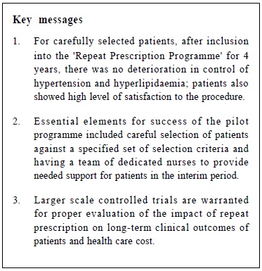 After implementation of the RP programme, control of hypertension and hyperlipidaemia remained stable. No adverse events were reported and patients’ satisfaction levels were high in this cohort. The essential elements of success for this pilot programme included careful selection of patients against the specified list of inclusion criteria and having a team of dedicated nurses to provide the needed support in patient review and use of medications. Hopefully, our study has painted a primitive framework for future development of the repeat prescription arrangement, to maximize patient coverage while balancing the quality of patient care and medication safety.
