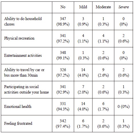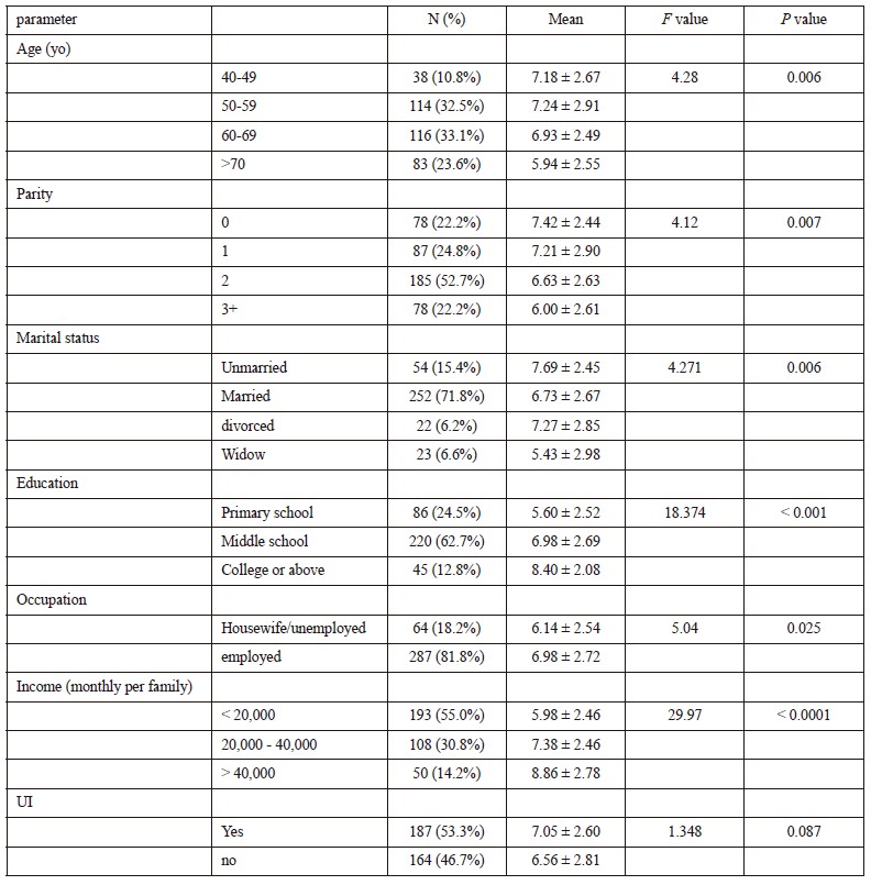 多因素分析顯示收入(B = 1.116, P < 0.001),教育水平(B = 0.768, P=0.002)以及有尿路失禁症狀(B = 0.651, P=0.015)