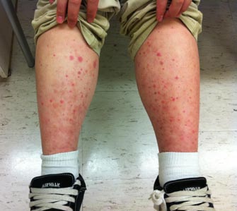 This usually starts as erythematous papules over the lower limbs