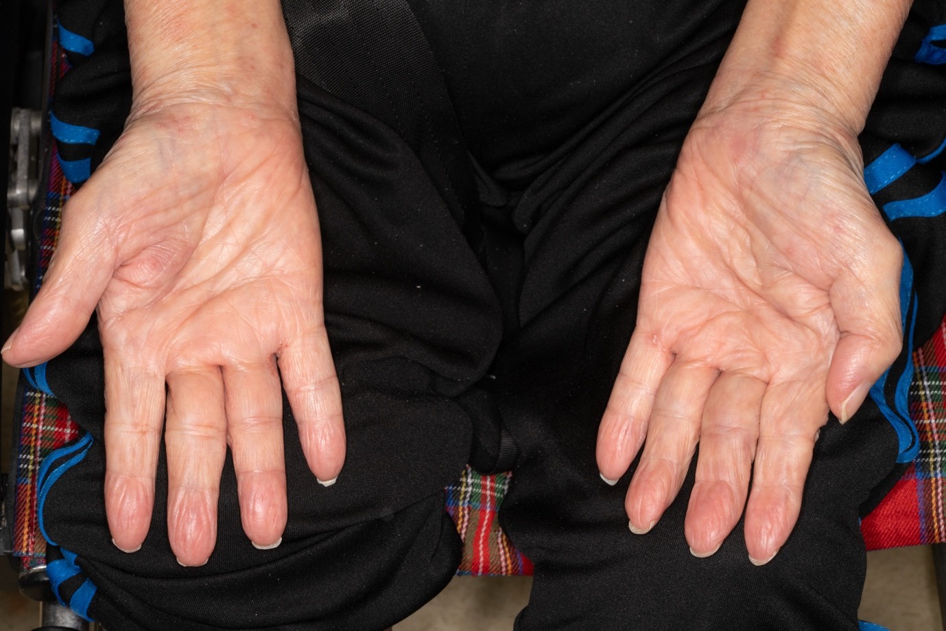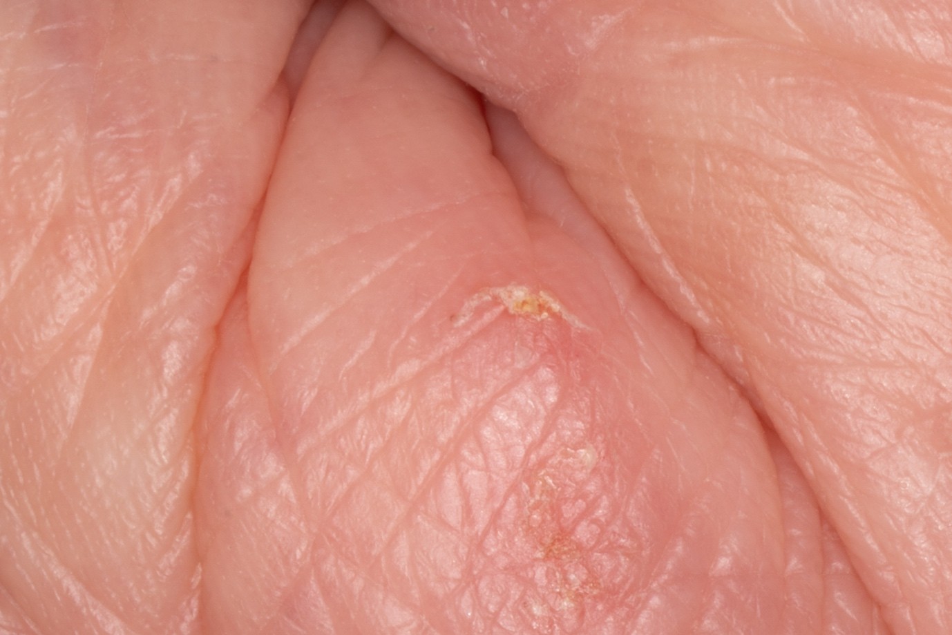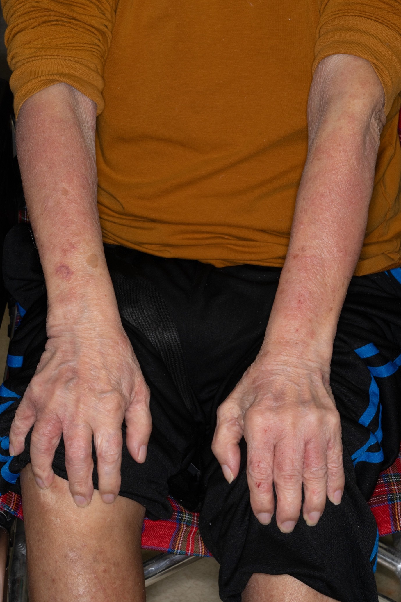 An 86-year-old man, a resident of an old age home, presented with generalised pruritic rash over his trunk and bilateral upper and lower limbs for over one year. His previous treatments include 2 courses of topical permethrin 5% lotion and intermittent topical corticosteroids, with minimal sustained improvement. On examination, the forearms and dorsum of hands showed ill-defined erythematous patches with excoriations. A characteristic sign was noted over his right thenar eminence, which became more conspicuous on dermoscopic examination.