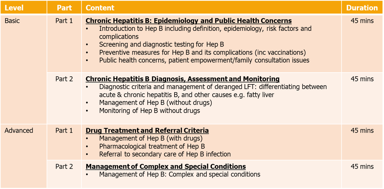 Please refer to the programme outline and topics to be covered in the first learning module about chronic hepatitis B management as below.