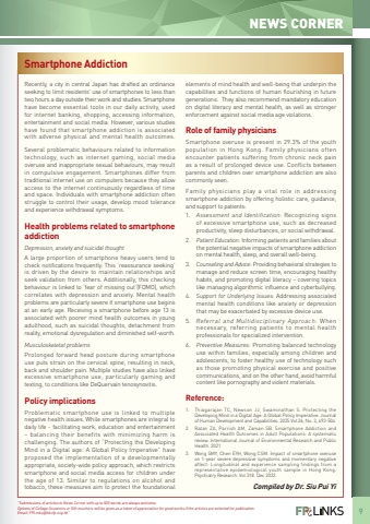 9NEWS CORNERSmartphone AddictionRecently, a city in central Japan has drafted an ordinance seeking to limit residents%u2019 use of smartphones to less than two hours a day outside their work and studies. Smartphone have become essential tools in our daily activity, used for internet banking, shopping, accessing information, entertainment and social media. However, various studies have found that smartphone addiction is associated with adverse physical and mental health outcomes.Several problematic behaviours related to information technology, such as internet gaming, social media overuse and inappropriate sexual behaviours, may result in compulsive engagement. Smartphones differ from traditional internet use on computers because they allow access to the internet continuously regardless of time and space. Individuals with smartphone addiction often struggle to control their usage, develop mood tolerance and experience withdrawal symptoms.Health problems related to smartphone addictionDepression, anxiety and suicidal thoughtA large proportion of smartphone heavy users tend to check notifications frequently. This %u2018reassurance seeking%u2019 is driven by the desire to maintain relationships and seek validation from others. Additionally, this checking behaviour is linked to %u2018fear of missing out%u2019(FOMO), which correlates with depression and anxiety. Mental health problems are particularly severe if smartphone use begins at an early age. Receiving a smartphone before age 13 is associated with poorer mind health outcomes in young adulthood, such as suicidal thoughts, detachment from reality, emotional dysregulation and diminished self-worth.Musculoskeletal problemsProlonged forward head posture during smartphone use puts strain on the cervical spine, resulting in neck, back and shoulder pain. Multiple studies have also linked excessive smartphone use, particularly gaming and texting, to conditions like DeQuervain tenosynovitis.Policy implicationsProblematic smartphone use is linked to multiple negative health issues. While smartphones are integral to daily life - facilitating work, education and entertainment %u2013 balancing their benefits with minimizing harm is challenging. The authors of %u201cProtecting the Developing Mind in a Digital age: A Global Policy Imperative%u201d have proposed the implementation of a developmentally appropriate, society-wide policy approach, which restricts smartphone and social media access for children under the age of 13. Similar to regulations on alcohol and tobacco, these measures aim to protect the foundational elements of mind health and well-being that underpin the capabilities and functions of human flourishing in future generations. They also recommend mandatory education on digital literacy and mental health, as well as stronger enforcement against social media age violations.Role of family physiciansSmartphone overuse is present in 29.3% of the youth population in Hong Kong. Family physicians often encounter patients suffering from chronic neck pain as a result of prolonged device use. Conflicts between parents and children over smartphone addiction are also commonly seen.Family physicians play a vital role in addressing smartphone addiction by offering holistic care, guidance, and support to patients:1.Assessment and Identification: Recognizing signs of excessive smartphone use, such as decreased productivity, sleep disturbances, or social withdrawal. 2.Patient Education: Informing patients and families about the potential negative impacts of smartphone addiction on mental health, sleep, and overall well-being.3.Counseling and Advice: Providing behavioral strategies to manage and reduce screen time, encouraging healthy habits, and promoting digital literacy %u2013 covering topics like managing algorithmic influence and cyberbullying.4.Support for Underlying Issues: Addressing associated mental health conditions like anxiety or depression that may be exacerbated by excessive device use.5.Referral and Multidisciplinary Approach: When necessary, referring patients to mental health professionals for specialized intervention.6.Preventive Measures: Promoting balanced technology use within families, especially among children and adolescents, to foster healthy use of technology such as those promoting physical exercise and positive communications, and on the other hand, avoid harmful content like pornography and violent materials.Reference:1.Thiagarajan TC, Newson JJ, Swaminathan S. Protecting the Developing Mind in a Digital Age: A Global Policy Imperative. Journal of Human Development and Capabilities. 2025 Vol 26, No. 3, 493-504. 2.Ratan ZA, Parrish AM, Zaman SB. Smartphone Addiction and Associated Health Outcomes in Adult Populations: A systematic review. International Journal of Environmental Research and Public Health. 20213.Wong SMY, Chen EYH, Wong CSM. Impact of smartphone overuse on 1-year severe depressive symptoms and momentary negative affect: Longitudinal and experience sampling findings from a representative epidemiological youth sample in Hong Kong. Psychiatry Research. Vol 318. Dec 2022.%u201cSubmissions of articles to News Corner with up to 500 words are always welcome. Options of College Souvenirs or Gift vouchers will be given as a token of appreciation for good works if the articles are selected for publication. Email: FPLinks@hkcfp.org.hk%u201dCompiled by Dr. Siu Pui Yi
