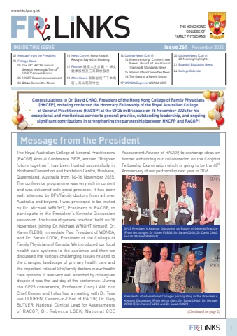 1INSIDE THIS ISSUETHE HONG KONG COLLEGE OF FAMILY PHYSICIANSwww.hkcfp.org.hkMessage from the President20College News (Con%u2019t):20Meeting Highlights21Board of Education News24College CalendarIssue261November 202501Message from the President04College News:04The 48th HKCFP Annual General Meeting & The 48thHKCFP Annual Dinner 05HKCFP Council Announcement06QA&A Committee News14College News (Con%u2019t):14Membership Committee News; Board of Vocational Training & Standards News 15Internal Affairs Committee News16The Diary of a Family Doctor17WONCA Express: WONCA 202510News Corner: Hong Kong is Ready to Say NO to Smoking12Feature:%u5065%u5eb7%u4eba%u751f%u8a08%u5283 - %u5a66%u5973%u5065%u5eb7%u670d%u52d9%u53ca%u4e09%u9ad8%u7be9%u6aa2%u670d%u52d913After Hours: %u7121%u6575%u79d8%u5883%u300c%u5343%u672c%u9ce5%u5c45%u300d%u9ad8%u5c71%u7a3b%u8377%u795e%u793e(Continued on page 2)The Royal Australian College of General Practitioners (RACGP) Annual Conference GP25, entitled %u201cBrighter future together%u201d, has been hosted successfully in Brisbane Convention and Exhibition Centre, Brisbane, Queensland, Australia from 14%u201316 November 2025. The conference programme was very rich in content and was delivered with great precision. It has been well attended by GPs/family doctors from all over Australia and beyond. I was privileged to be invited by Dr. Michael WRIGHT, President of RACGP, to participate in the President%u2019s Keynote Discussion session on %u201cthe future of general practice%u201d held on 16 November, joining Dr. Michael WRIGHT himself, Dr. Karen FLEGG, Immediate Past President of WONCA, and Dr. Sarah COOK, President of the College of Family Physicians of Canada. We introduced our local health care systems to the audience and then we discussed the various challenging issues related to the changing landscape of primary health care and the important roles of GPs/family doctors in our health care systems. It was very well attended by colleagues despite it was the last day of the conference. During the GP25 conference, Professor Cindy LAM, our Chief Censor and I also had a meeting with Dr. Tess van DUUREN, Censor-in-Chief of RACGP, Dr. Gary BUTLER, National Clinical Lead for Assessments of RACGP, Dr. Rebecca LOCK, National CCE GP25 President's Keynote Discussion on Future of General Practice (From left to right: Dr. Karen FLEGG, Dr. Sarah COOK, Dr. David CHAO and Dr. Michael WRIGHT)Presidents of international Colleges participating in the President%u2019s Keynote Discussion (From left to right: Dr. David CHAO, Dr. Michael WRIGHT, Dr. Karen FLEGG and Dr. Sarah COOK)Assessment Advisor of RACGP, to exchange ideas on further enhancing our collaboration on the Conjoint Fellowship Examination which is going to be the 40thAnniversary of our partnership next year in 2026.Congratulations to Dr. David CHAO, President of the Hong Kong College of Family Physicians (HKCFP), on being conferred the Honorary Fellowship of the Royal Australian College of General Practitioners (RACGP) at the GP25 in Brisbane on 15 November 2025 for his exceptional and meritorious service to general practice, outstanding leadership, and ongoing significant contributions in strengthening the partnership between HKCFP and RACGP!