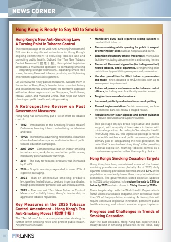 10NEWS CORNERHong Kong is Ready to Say NO to SmokingHong Kong%u2019s New Anti-Smoking La A Turning Point in Tobacco ControlThe recent passage of the 2025 Anti-Smoking (Amendment) Bill marks a significant milestone in Hong Kong%u2019s ongoing commitment to reducing tobacco use and protecting public health. Dubbed the %u201cTen New Tobacco Control Measures%u201d (%u63a7%u7159%u5341%u62db), this updated legislation advocates a multifaced approach to combating smoking %u2014 integrating stronger restrictions, expanding smoke-free zones, banning flavoured tobacco products, and tightening enforcement against illicit cigarettes.Let us review the newly passed measures, evaluate them in the context of Hong Kong%u2019s broader tobacco control history and cessation trends, and compare the territory%u2019s approach with other Asian regions such as Singapore, South Korea, Macau, Japan, and mainland China. That helps our future planning on public health and policy-making.A Retrospective Review on Past Government Measures:Hong Kong has consistently put a lot of effort on tobacco control:%u20221982 %u2013 Introduction of the Smoking (Public Health) Ordinance, banning tobacco advertising on television and radio.%u20221990s %u2013 Incremental advertising restrictions, expansion of smoke-free indoor spaces, and introduction of public tobacco education campaigns.%u20222007%u20132009 %u2013 Comprehensive ban on indoor smoking in restaurants, workplaces, and other public areas; mandatory pictorial health warnings.%u20222011 %u2013 The duty for tobacco products was increased by 41.46%.%u20222016 %u2013 Graphic warnings expanded to cover 85% of cigarette packaging.%u20222022 %u2013 Ban on alternative smoking products (e-cigarettes, heated tobacco devices) imports and sales, though possession for personal use was initially allowed.%u20222025 %u2013 The current %u201cTen New Tobacco Control Measures%u201d solidify Hong Kong%u2019s leadership in aggressive tobacco regulation.Key Measures in the 2025 Tobacco Control Amendment - Hong Kong%u2019s Ten Anti-Smoking Moves (%u63a7%u7159%u5341%u62db)The \further lower smoking rates and protect public health. Key provisions include:%u2022Mandatory duty-paid cigarette stamp system to combat illicit tobacco. %u2022Ban on smoking while queuing for public transport or entering key sites such as hospitals and parks. %u2022Expansion of statutory smoke-free areas to more public facilities%u2014including daycare centers and nursing homes. %u2022Ban on all flavoured cigarettes (including menthol), heated tobacco, and e-cigarettes, strengthening prior restrictions by prohibiting even personal possession. %u2022Harsher penalties for illicit tobacco possession and trade%u2014fines doubled to HK$2 million, with up to seven years%u2019 imprisonment. %u2022Enhanced powers and resources for tobacco control officers, including search authority in enforcement. %u2022Tougher bans on sales to minors%u2022Increased publicity and education around quitting %u2022Phased implementation: Certain measures, such as the menthol ban, will follow a staged rollout. %u2022Regulations for clear signage and border guidance to reduce confusion and support tourism.This package enjoys broad legislative and public support, with majority of lawmakers in favour with minimal opposition. According to Secretary for Health Prof Chung-mau LO, this legislative package is rooted in scientific evidence and public consensus, with the primary goal of safeguarding the next generation. He noted that %u201ca smoke-free Hong Kong%u201d is the prevailing societal aspiration, framing tobacco control as a must-answer question rather than a policy choice.Hong Kong%u2019s Smoking Cessation TargetsHong Kong has long maintained some of the lowest smoking prevalence rates globally. As of 2023, daily cigarette smoking prevalence hovered around 9.1% of the population %u2014 markedly lower than many industrialized economies. The government%u2019s stated objective, updated in its 2024 policy address, is to reduce the rate to 7.8% or below by 2025 and aim closer to 5% by the early 2030sThese targets align with the World Health Organization%u2019s (WHO) vision of a tobacco endgame, often defined as fewer than 5% of the population smoking. Achieving this will require continued legislative innovation, persistent public health advocacy, and robust cessation support systems.Progress and Challenges in Trends of Smoking CessationOver the past decades, Hong Kong has experienced a steady decline in smoking prevalence. In the 1980s, daily
