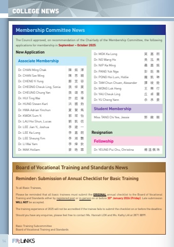 14COLLEGE NEWSMembership Committee NewsThe Council approved, on recommendation of the Chairlady of the Membership Committee, the following applications for membership in September %u2013 October 2025:New ApplicationAssociate MembershipDr. CHAN Ming Chak%u9673%u9298%u6fa4Dr. CHAN Sze Wing%u9673%u601d%u7a4eDr. CHENG Yi Yung%u912d%u5b9c%u5bb9Dr. CHEONG Cheuk Ling, Sonia%u5f35%u502c%u83f1Dr. CHEUNG Chung Yan%u5f35%u980c%u6069Dr. HUI Ting Wai%u8a31%u5ead%u744bDr. HUNG Steven Karl%u6d2a%u570b%u921eDr. HWA Adrian Yinchun%u590f%u8ce2%u96cbDr. KWOK Sum Yi%u90ed%u741b%u6021Dr. LAU Hoi Shun, Lucas%u5289%u51f1%u4fe1Dr. LEE Jian Yi, Joshua%u674e%u5efa%u4e00Dr. LEE Ka Long%u674e%u5609%u6717Dr. LEE Sheung Yim%u674e%u6e58%u8277Dr. LI Wai Yam%u674e%u7152%u6b3dDr. MAK Hollam%u9ea5%u6667%u9716Dr. MOK Ka Long%u83ab%u5609%u6717Dr. NG Wang Ho%u5433%u6cd3%u660aDr. NIP Ka Ming%u8076%u5609%u9298Dr. PANG Yuk Nga%u5f6d%u923a%u96c5Dr. PONG Hoi Lum, Hollie%u9f90%u51f1%u7433Dr. TAM Chun Chuen, Alexander%u8b5a%u7ae3%u9293Dr. WONG Lok Heng%u738b%u6a02%u884cDr. YAU Cheuk Ling%u4e18%u5353%u9748Dr. YU Cheng Yann%u4f59%u627f%u664fStudent MembershipMiss TANG Chi Yee, Jessie%u9127%u7dfb%u9824ResignationFellowshipDr. YEUNG Pui Chu, Christina%u694a%u6eab%u4f69%u73e0Board of Vocational Training and Standards NewsReminder: Submission of Annual Checklist for Basic TrainingTo all Basic Trainees, Please be reminded that all basic trainees must submit the ORIGINAL annual checklist to the Board of Vocational Training and Standards either by registered post or in-person on or before 30th January 2026 (Friday). Late submission WILL NOT be accepted.The training experience of 2025 will not be accredited if the trainee fails to submit the checklist on or before the deadline.Should you have any enquiries, please feel free to contact Ms. Hannah LOK and Ms. Kathy LAI at 2871 8899.Basic Training SubcommitteeBoard of Vocational Training and Standards