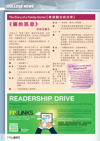 16COLLEGE NEWSThe Diary of a Family Doctor%u3010%u5bb6%u5ead%u91ab%u751f%u7684%u65e5%u5e38%u3011%u300a%u8178%u7684%u8a0a%u606f%u300b%u51bc%u9298%u5168%u91ab%u751f 4 8%u6b72%u5973%u58eb%uff0c%u8179%u7009%u4e86%u5169%u5929%uff0c%u8179%u90e8%u4e2d%u592e%u75bc%u75db%uff0c%u6c92%u6709%u5614%u5410%uff0c%u6c92%u6709%u5403%u904e%u4e0d%u6f54%u98df%u7269%uff0c%u4e5f%u6c92%u6709%u4e0a%u547c%u5438%u9053%u611f%u67d3%u75c7%u72c0%u3002%u8eab%u9ad4%u6aa2%u67e5%u6b63%u5e38%uff0c%u6c92%u6709%u812b%u6c34%u60c5%u6cc1%u3002%u8868%u9762%u4e0a%u662f%u4e00%u822c%u8178%u80c3%u708e%uff0c%u4f46%u770b%u7740%u5979%u7684%u75c5%u6b77%u8a18%u9304%uff0c%u4f3c%u4e4e%u53e6%u6709%u53ef%u80fd%u3002%u5979%u5230%u8a3a%u6240%u770b%u8179%u7009%uff0c%u9019%u534a%u5e74%u5df2%u6709%u4e09%u6b21%uff0c%u6bcf%u6b21%u6301%u7e8c%u6578%u5929%uff0c%u8a3a%u65b7%u90fd%u662f%u8178%u80c3%u708e%uff0c%u5b89%u6392%u904e%u5927%u4fbf%u57f9%u83cc%uff0c%u7d50%u679c%u6b63%u5e38%u3002%u5979%u9ad4%u91cd%u6c92%u6709%u6e1b%u8f15%uff0c%u80c3%u53e3%u5982%u5e38%uff0c%u4e00%u76f4%u6c92%u6709%u5927%u4fbf%u51fa%u8840%u548c%u7532%u72c0%u817a%u7684%u75c7%u72c0%u3002%u5979%u53f3%u8033%u639b%u8457%u85cd%u7259%u8033%u6a5f%uff0c%u624b%u6a5f%u5728%u8a3a%u75c7%u904e%u7a0b%u4e2d%u5df2%u97ff%u4e86%u4e09%u6b21%uff0c%u90fd%u662f%u516c%u53f8%u4f86%u96fb%uff0c%u72c0%u751a%u5fd9%u788c%uff0c%u75b2%u614b%u7562%u73fe%u3002%u6211%u0009 %uff1a%u0009%u300c%u59b3%u505a%u908a%u884c?%u300d%u5973%u58eb%u0009%uff1a%u0009%u300c%u6211%u63f8%u8eca%u5605%uff0c%u51fa%u5165%u53e3%u751f%u610f%u3002%u300d%u6709%u4e00%u7a2e%u7537%u6027%u7684%u8c6a%u9081%u3002%u6211%u0009 %uff1a%u0009%u300c%u6211%u898b%u59b3%u597d%u5fd9%u558e%uff0c%u505a%u5622%u4fc2%u54aa%u597d%u5927%u58d3%u529b?%u300d%u5973%u58eb%u0009%uff1a%u0009%u300c%u4fc2%u5440%uff0c%u516c%u53f8%u8d70%u5497%u500b%u4eba%uff0c%u591a%u5497%u5622%u505a%u3002%u4f9d%u5bb6%u5f97%u8fd4%u6211%u540c%u5462%u500b%u62cd%u6a94%u9802%u4f4f%uff0c%u500b%u62cd%u6a94%u8eab%u9ad4%u9ebb%u9ebb%u54cb%uff0c%u6211%u5514%u60f3%u5f71%u97ff%u4f62%uff0c%u81ea%u5df1%u505a%u591a%u5572%u56c9%u3002%u300d%u6211%u0009 %uff1a%u300c%u59b3%u771f%u4fc2%u8b58%u70ba%u4eba%u7740%u60f3%u558e%u3002%u300d%u5973%u58eb%u0009%uff1a%u300c%u662f%u4f46%u5566%uff0c%u5e6b%u5f97%u4eba%u54aa%u5e6b%u56c9%u3002%u300d%u6211%u0009 %uff1a%u300c%u4f46%u4fc2%u5982%u679c%u59b3%u500b%u8eab%u9ad4%u60f3%u59b3%u5e6b%u4e0b%u4f62%u5148%u5462%ufe56%u6709%u5187%u8ad7%u904e%u59b3%u6210%u65e5%u809a%u75fe%u53ef%u80fd%u4fc2%u8178%u6613%u6fc0?%u300d%u5973%u58eb%u4e00%u6123%u3002%u6211%u0009 %uff1a%u300c%u8178%u6613%u6fc0%u53c8%u53eb%u8178%u80c3%u7126%u616e%u75c7%uff0c%u56e0%u70ba%u59b3%u5e73%u6642%u58d3%u529b%u5927%u5f15%u81f4%u7126%u616e%uff0c%u9023%u8178%u80c3%u90fd%u8b8a%u5f97%u597d%u5bb9%u6613%u6fc0%u52d5%uff0c%u6210%u65e5%u81ea%u5df1%u55ba%u5ea6%u90c1%uff0c%u54aa%u6709%u809a%u75db%u809a%u7009%u56c9%u3002%u5178%u578b%u5605%u75c5%u5fb5%u4fc2%u5c59%u5b8c%u4e4b%u5f8c%u809a%u75db%u6703%u6e1b%u8f15%u597d%u591a%u3002%u300d%u5973%u58eb%u0009%uff1a%u0009%u300c%u4fc2%u561e%u6211%u5c31%u4fc2%u5481%u3002%u5481%u61c9%u8a72%u9ede%u505a?%u300d%u6211%u0009 %uff1a%u0009%u300c%u5514%u597d%u9802%u5481%u591a%u5566%uff0c%u9867%u5413%u81ea%u5df1%u5148%uff0c%u5b78%u5413%u653e%u4f4e%u4e00%u5572%u5de5%u4f5c%uff0c%u540c%u57cb%u7df4%u7fd2%u5413%u5572%u653e%u9b06%u5605%u6280%u5de7%u3002%u975c%u89c0%u3001%u8179%u5f0f%u547c%u5438%uff0c%u6216%u8005%u55ba%u5c4b%u4f01%u7df4%u5413%u5572%u7c21%u55ae%u5605%u904b%u52d5%uff0c%u90fd%u4e00%u5b9a%u6709%u5e6b%u52a9%u3002%u5148%u8655%u7406%u597d%u81ea%u5df1%uff0c%u5148%u6709%u80fd%u529b%u5e6b%u4eba%u3002%u300d%u6700%u5f8c%u6211%u53ea%u7d66%u5979%u767c%u4e86%u5230%u8a3a%u7d19%u3002%u5973%u58eb%u0009%uff1a%u300c%u4f60%u5605%u5efa%u8b70%u4fc2%u975e%u4e00%u822c%u5605%u5efa%u8b70%uff0c%u6211%u6703%u597d%u597d%u8a18%u4f4f%u3002%u300d%u5979%u81c9%u4e0a%u7a81%u7136%u6709%u4e86%u7b11%u5bb9%uff0c%u6709%u4e86%u751f%u6c23%u3002The Diary of a Family Doctor%u5bb6%u5ead%u91ab%u751f%u7684%u65e5%u5e38Submission of articles to The Diary of a Family Doctor with up to 600 words in Chinese or 400 words in English are always welcome. Options of College Souvenirs or Gift vouchers will be given as token of appreciation if the articles are selected for publication. Email: FPLinks@hkcfp.org.hkREADERSHIP DRIVEneed your views about its role as the newsletter of College!Selected returns would be published in FP Links and gift vouchers would be given as token of appreciation.You can also access the Google form through the link, in addition to the QR code.https://forms.gle/KmZwgYpzB3F977Mi8FP Links also need your support through submissions to our various columns: Feature / Family Doctors Column/News Corner/ The Diary of a Family Doctor /After Hours.If articles are selected for publication, Options of College Souvenirs or Gift vouchers will also be given as token of appreciationShare yourthoughtsCongratulations! The returns from the following doctor has been selected for October 2025 issue:Dr. TUNG Po Yin