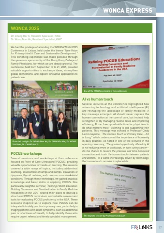 17WONCA EXPRESSWe had the privilege of attending the WONCA World 2025 Conference in Lisbon, held under the theme %u201cNew Vision for Primary Health Care and Sustainable Development.%u201d This enriching experience was made possible through the generous sponsorship of the Hong Kong College of Family Physicians, for which we are deeply grateful. The conference, held from September 17 to 21, 2025, provided valuable opportunities to exchange ideas, strengthen global connections, and explore innovative approaches to patient care.Dr. Chang Hoi Yi, Resident Specialist, KWCDr. Wong Man Ho, Resident Specialist, KWCWONCA 2025AI vs human touchSeveral lectures at the conference highlighted how advancing technology and artificial intelligence (AI) are reshaping the landscape of family medicine. A key message emerged: AI should never replace the human connection at the core of care, but instead help strengthen it. By managing routine tasks and improving efficiency, AI can free up valuable time for physicians to do what matters most%u2014listening to and supporting their patients. This message was echoed in Professor Cindy Lam%u2019s keynote, %u201cThe Human Touch of Primary Care %u2013 Art is Long,%u201d which underscored the importance of humanity in daily practice. As noted in one of the lectures in the opening ceremony, %u201cThe greatest opportunity offered by AI is not reducing errors or workloads, or even curing cancer%u2014it%u2019s the chance to restore the precious and time-honoured connection and trust- the human touch- between patients and doctors.%u201d In a world increasingly driven by technology, the human touch remains irreplaceable.POCUS workshops Several seminars and workshops at the conference focused on Point-of-Care Ultrasound (POCUS), providing valuable opportunities for hands-on learning. The sessions covered a wide range of topics, including abdominal scanning, assessment of lumps and bumps, evaluation of dyspnoea, thyroid nodules, and common musculoskeletal conditions. Through these workshops, we gained practical knowledge and basic skills in applying POCUS. One particularly insightful seminar, %u201cRefining POCUS Education: Building Consensus and Standardization in Family Medicine Residencies in the USA,%u201d shared their plans to develop a structured POCUS curriculum and reliable assessment tools for evaluating POCUS proficiency in the USA. These sessions inspired us to explore how POCUS can be integrated into daily practice in primary care, particularly in triaging patients with acute symptoms, such as abdominal pain or shortness of breath, to help identify those who require urgent referral and timely specialist management.One of the POCUS seminars in the conferenceFrom left to right: Dr. WONG Man Ho, Dr. CHAN Kin Wai, Dr. WONG Yuk Shan, Dr. CHANG Hoi YiThe keynote lecture by Professor Cindy LAM