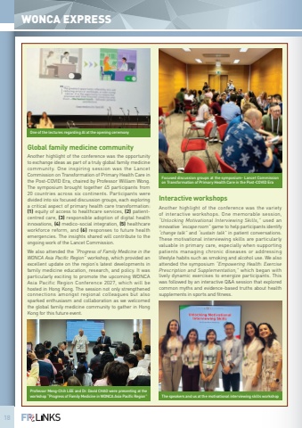 18WONCA EXPRESSGlobal family medicine communityAnother highlight of the conference was the opportunity to exchange ideas as part of a truly global family medicine community. One inspiring session was the Lancet Commission on Transformation of Primary Health Care in the Post-COVID Era, chaired by Professor William Wong. The symposium brought together 45 participants from 20 countries across six continents. Participants were divided into six focused discussion groups, each exploring a critical aspect of primary health care transformation: (1) equity of access to healthcare services, (2) patientcentred care, (3) responsible adoption of digital health innovations, (4) medico-social integration, (5) healthcare workforce reform, and (6) responses to future health emergencies. The insights shared will contribute to the ongoing work of the Lancet Commission.We also attended the %u201cProgress of Family Medicine in the WONCA Asia Pacific Region%u201d workshop, which provided an excellent update on the region%u2019s latest developments in family medicine education, research, and policy. It was particularly exciting to promote the upcoming WONCA Asia Pacific Region Conference 2027, which will be hosted in Hong Kong. The session not only strengthened connections amongst regional colleagues but also sparked enthusiasm and collaboration as we welcomed the global family medicine community to gather in Hong Kong for this future event.Interactive workshopsAnother highlight of the conference was the variety of interactive workshops. One memorable session, %u201cUnlocking Motivational Interviewing Skills,%u201d used an innovative %u201cescape room%u201d game to help participants identify %u201cchange talk%u201d and %u201csustain talk%u201d in patient conversations. These motivational interviewing skills are particularly valuable in primary care, especially when supporting patients managing chronic diseases or addressing lifestyle habits such as smoking and alcohol use. We also attended the symposium %u201cEmpowering Health: Exercise Prescription and Supplementation,%u201d which began with lively dynamic exercises to energize participants. This was followed by an interactive Q&A session that explored common myths and evidence-based truths about health supplements in sports and fitness.One of the lectures regarding AI at the opening ceremonyProfessor Meng-Chih LEE and Dr. David CHAO were presenting at the workshop %u201cProgress of Family Medicine in WONCA Asia Pacific Region%u201dThe speakers and us at the motivational interviewing skills workshopFocused discussion groups at the symposium- Lancet Commission on Transformation of Primary Health Care in the Post-COVID Era