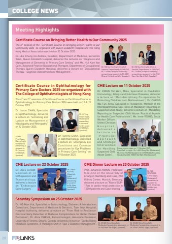 20COLLEGE NEWSMeeting HighlightsCertificate Course on Bringing Better Health to Our Community 2025Certificate Course in Ophthalmology for Primary Care Doctors 2025 co-organized with The College of Ophthalmologists of Hong KongCME Lecture on 11 October 2025The 3rd session of the %u201cCertificate Course on Bringing Better Health to Our Community 2025%u201d co-organized with Queen Elizabeth Hospital and The Hong Kong Medical Association was held on 25 October 2025. Dr. LEE Chung Ho Andrew, Resident, Department of Medicine, Geriatrics Team, Queen Elizabeth Hospital, delivered the lectures on %u201cDiagnosis and Management of Dementia in Primary Care Setting%u201d and Ms. HUI Kam Yan Carol, Advanced Practice Occupational Therapist, Department of Occupational Therapy, Queen Elizabeth Hospital, delivered a lecture on %u201cOccupational Therapy - Cognitive Assessment and Management%u201d.The 4th and 5th sessions of Certificate Course on Certificate Course in Ophthalmology for Primary Care Doctors 2024 were held on 12 & 19 October 2025. Dr. KWAN Yat Wah, Mike, Specialist in Paediatric Immunology, Allergy and Infectious Diseases, delivered a lecture on %u201cMultidisciplinary Co-operation for Protecting Children from Maltreatment%u201d; Dr. CHENG Wai Fun, Anna, Specialist in Paediatrics; Member of the Interdepartmental Task Force on Mandatory Reporting on Suspected Child Abuse, delivered a lecture on %u201cMandatory Reporting on Suspected Child Abuse: Practical Aspects for Health Care Professionals%u201d; Ms. Irene YEUNG, Social Worker Officer, United Christian H o s p i t a l , d e l i v e r e d a l e c t u r e o n %u201c P r a c t i c a l A p p r o a c h and Strategic I n t e r v e n t i o n fo r H a n d l i n g Suspected Child Abuse Cases%u201d.Dr. KO Siu Hin (right, Chief of Service, Department of FM&PHC, KC Cluster, Hospital Authority) presenting a souvenir to Dr. LEE Chung Ho Andrew (left, Speaker).Dr. LI Ting Kwan (right, Moderator) presenting a souvenir to Dr. Jason CHAN (left, Speaker).Dr. KO Siu Hin (right, Chief of Service, Department of FM&PHC, KC Cluster, Hospital Authority) presenting a souvenir to Ms. HUI Kam Yan Carol (left, Speaker).Dr. MA Ping Kwan, Danny (right, Moderator) presenting a souvenir to Dr. Tommy CHAN (left, Speaker).Group photos taken on 11 October 2025From left to right: Dr. LAM Wing Wo (Moderator), Ms. Irene YEUNG (Speaker), Dr. CHENG Wai Fun, Anna (Speaker) and Dr. KWAN Yat Wah, Mike (Speaker)Dr. Jason CHAN, Specialist in Ophthalmology, delivered a lecture on %u201cScreening and Update on Management of Maculopathy and Retinopathy%u201d on 12 October 2025.Dr. Tommy CHAN, Specialist in Ophthalmology, delivered a lecture on %u201cEmergency Eye Conditions and Common procedures for Eye Problems in Primary Care Setting%u201d on 19 October 2025.CME Lecture on 22 October 2025CME Dinner Lecture on 23 October 2025Dr. Alex CHOW, S p e c i a l i s t i n Orthopaedics and Tr a u m a t o l o g y, delivered a lecture on %u201cEndoscopic Spine Surgery%u201d.Prof. Johannes MANN, Professor, Medicine at the University of Erlangen-N%u00fcrnberg and Head, KfH Kidney Center, Munich, Germany, delivered a lecture on %u201cRole of GLP1RAs in cardio-renal protection in T2DM patients and Case sharing%u201d.Dr. CHAN Kiu Pak Kilpatrick (right, Moderator) presenting a souvenir to Dr. Alex CHOW (left, Speaker).Dr. NG VENTURA Lorna (right, Moderator) presenting a souvenir to Prof. Johannes MANN (left, Speaker).Saturday Symposium on 25 October 2025Dr. NG Man Yuk, Specialist in Endocrinology, Diabetes & Metabolism; Consultant, Department of Medicine & Geriatric, Tuen Mun Hospital, Hospital Authority, delivered a lecture on %u201cFrom Risk to Resilience: Practical Early Detection of Diabetes Complications for Better Patient Outcomes%u201d; Dr. Alice CHENG, Endocrinologist; Associate Professor, University of Toronto, Ontario, Canada, delivered a lecture on %u201cCardio Kidney Metabolic Syndrome: A Paradigm Shift in Type 2 Diabetes Management%u201d.Dr. CHAN King Hong (left, Moderator) presenting a souvenir to Dr. NG Man Yuk (right, Speaker).Dr. CHAN King Hong (left, Moderator) presenting a souvenir to Dr. Alice CHENG (right, Speaker).