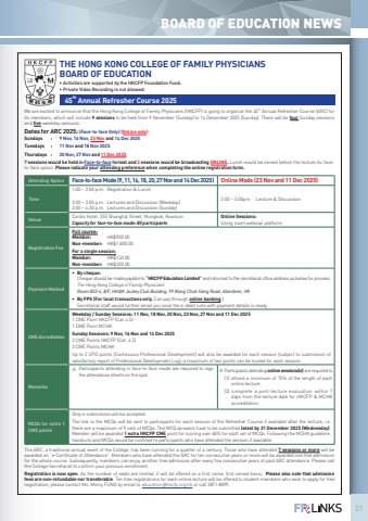 21BOARD OF EDUCATION NEWSAttending OptionFace-to-face Mode (9, 11, 16, 18, 20, 27 Nov and 14 Dec 2025)Online Mode (23 Nov and 11 Dec 2025)Time1:00 %u2013 2:00 p.m.Registration & Lunch2:00 %u2013 3:00 p.m.Lectures and Discussion (Weekday)2:00 %u2013 4:30 p.m.Lectures and Discussion (Sunday)2:00 %u2013 3:00pmLecture & DiscussionVenueCordis Hotel, 555 Shanghai Street, Mongkok, KowloonCapacity for face-to-face mode: 80 participantsOnline Sessions:Using zoom webinar platformRegistration FeeFull course:Member:HK$900.00Non-member:HK$1,800.00For a single session:Member:HK$150.00Non-member:HK$300.00Payment Method%u2022By cheque:Cheque should be made payable to %u201cHKCFP Education Limited%u201d and returned to the secretarial office address as below for process:The Hong Kong College of Family PhysiciansRoom 803-4, 8/F, HKAM Jockey Club Building, 99 Wong Chuk Hang Road, Aberdeen, HK%u2022By FPS (For local transactions only. Can pay through online banking.)Secretarial staff would further email you once the e-debit note with payment details is ready.CME AccreditationWeekday / Sunday Sessions: 11 Nov, 18 Nov, 20 Nov, 23 Nov, 27 Nov and 11 Dec 20251 CME Point HKCFP (Cat. 4.5)1 CME Point MCHKSunday Sessions: 9 Nov, 16 Nov and 14 Dec 20253 CME Points HKCFP (Cat. 4.5)3 CME Points MCHKUp to 2 CPD points (Continuous Professional Development) will also be awarded for each session (subject to submission of satisfactory report of Professional Development Log); a maximum of two points can be scored for each session.Remarks%uf0b2Participants attending in face-to-face mode are required to sign the attendance sheets on the spot.%uf0b2Participants attending online sessions(s) are required to(1)attend a minimum of 75% of the length of each online lecture,(2)complete a post-lecture evaluation within 7 days from the lecture date for HKCFP & MCHK accreditation.MCQs for extra 1 CME pointsOnly e-submission will be accepted.The link to the MCQs will be sent to participants for each session of the Refresher Course if available after the lecture, i.e. there are a maximum of 9 sets of MCQs. The MCQ answers have to be submitted latest by 31 December 2025 (Wednesday)Member will be awarded 1 extra HKCFP CME point for scoring over 60% for each set of MCQs. Following the MCHK guideline, handouts and MCQs would be confined to participants who have attended the session if available.We are excited to announce that the Hong Kong College of Family Physicians (HKCFP) is going to organize the 45th Annual Refresher Course (ARC) for its members, which will include 9 sessions to be held from 9 November (Sunday) to 14 December 2025 (Sunday). There will be four Sunday sessions and five weekday sessions.Dates for ARC 2025: (Face-to-face Only) (Online only)Sundays: 9 Nov, 16 Nov,23 Nov and 14 Dec 2025Tuesdays: 11 Nov and 18 Nov 2025Thursdays:20 Nov, 27 Nov and 11 Dec 20257 sessions would be held in Face-to-face format and 2 sessions would be broadcasting ONLINE. Lunch would be served before the lecture for faceto-face option. Please indicate your attending preference when completing the online registration form.%u2022 Activities are supported by the HKCFP Foundation Fund.%u2022 Private Video Recording is not allowed. THE HONG KONG COLLEGE OF FAMILY PHYSICIANS BOARD OF EDUCATION45th Annual Refresher Course 2025The ARC, a traditional annual event of the College, has been running for a quarter of a century. Those who have attended 7 sessions or more will be awarded an %u201ce-Certificate of Attendance%u201d. Members who have attended the ARC for ten consecutive years or more will be awarded one free admission for the whole course. Subsequently, members can enjoy another free admission after every five consecutive years of paid ARC attendance. Please call the College Secretariat to confirm your previous enrollment.Registration is now open. As the number of seats are limited, it will be offered on a first come, first served basis. Please also note that admission fees are non-refundable nor transferable. Ten free registrations for each online lecture will be offered to student members who wish to apply for free registration, please contact Ms. Minny FUNG by email to education@hkcfp.org.hk or call 2871 8899.