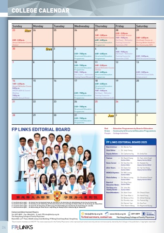 24COLLEGE CALENDARFP LINKS EDITORIAL BOARDRed:Education Programmes by Board of EducationGreen:Community & Structured Education ProgrammesPurple:College ActivitiesContact and Advertisement EnquiryTel: 2871 8899 Fax: 2866 0616 E-mail: FPLinks@hkcfp.org.hkThe Hong Kong College of Family PhysiciansRoom 803-4, 8th Floor, HKAM Jockey Club Building, 99 Wong Chuk Hang Road, Hong Kong%u201cRestricted to members of HKCFP. The views expressed in the Family Physicians Links represent personal view only and are not necessarily shared by the College or the publishers. Copyrights reserved.%u201dhkcfp@hkcfp.org.hkwww.hkcfp.org.hk2871 8899To find out more, contact us:The Hong Kong College of Family PhysiciansFP LINKS EDITORIAL BOARD 2025Board Advisor:Dr. Wendy TsuiChief Editor:Dr. Judy ChengDeputy Editors: Dr. Catherine NgDr. Anita FanFeature:Dr. David ChengDr. Tam John HughSection EditorDeputy Section EditorNews Corner:Dr. Sze Hon HoDr. Natalie SiuSection Editor Deputy Section EditorAfter Hours:Dr. Gavin SinDr. Yip Tze HungSection EditorDeputy Section Editor WONCA Express:Dr. Will LeungSection EditorPhoto Gallery:Dr. Maria LeungDr. Christina CheukSection Editor Deputy Section EditorBoard of Education News:Dr. King ChanSection EditorThe Diary of a Family Doctor:Dr. John WuSection EditorBoard Members:Dr. Alvin ChanDr. Cheryl ChanDr. Chan Man LiDr. Heidi FungDr. Rebecca HouDr. Alfred KwongDr. Dorothy LawDr. Patrick NgDr. Patrick TsaiDr. Eva TsuiProf. Martin WongDr. Raymond Yeung%u5bb6%u5ead%u91ab%u751f%u5171%u806f%u7e6b %u5b88%u8b77%u8eab%u5fc3%u6700%u5230%u4f4dSundayMondayTuesdayWednesdayThursdayFridaySaturday232:00 - 3:00 p.m.Annual Refresher Course (Online)242526271:00 %u2013 3:00 p.m.Annual Refresher Course4:00 %u2013 6:00 p.m. Structured Education Programme282:30 %u2013 3:30 p.m.Online Video Session7:00 %u2013 9:00 p.m.Exit Exam - Refresher Training Course for Examiners (PA)292:00 %u2013 4:00 p.m.Certificate Course on Brining Better Health to Our Community 2025301232:30 %u2013 7:00 p.m. Structured Education Programme44:00 %u2013 6:00 p.m. Structured Education Programme57:00 %u2013 9:00 p.m.Exit Exam - Refresher Training Course for Examiners (CSA)62:30 %u2013 5:30 p.m.DFM Structured Seminar789102:30 %u2013 7:00 p.m. Structured Education Programme7:00 %u2013 9:00 p.m.Exit Exam - Refresher Training Course (Research)112:00 - 3:00 p.m.Annual Refresher Course (Online)4:00 %u2013 6:00 p.m. Structured Education Programme12132:30 %u2013 5:00 p.m.DFM FM Clinical Skills Enhancement141:00 %u2013 4:30 p.m.Annual Refresher Course5:00 p.m.HKCFP AGM & Council Meeting7:00 p.m.HKCFP Annual Dinner1516172:30 %u2013 7:00 p.m. Structured Education Programme184:00 %u2013 6:00 p.m. Structured Education Programme7:00 %u2013 9:00 p.m.Exit Exam - Refresher Training Course for Examiners (Clinical Audit)1920212223242:30 %u2013 7:00 p.m. Structured Education Programme252627282930312:30 %u2013 7:00 p.m. Structured Education Programme1234th row (from left to right):Dr. Patrick Tsai, Dr. Raymond Yeung, Dr. Chan Man Li, Dr. Alvin Chan, Dr. Alfred Kwong, Dr. Eva Tsui, Dr. Patrick Ng3rd row (from left to right):Dr. Dorothy Law, Dr. Heidi Fung, Dr. Christina Cheuk, Dr. Tam John Hugh, Dr. Rebecca Hou, Dr. Yip Tze Hung, Dr. Cheryl Chan2nd row (from left to right):Dr. Gavin Sin, Dr. King Chan, Dr. Will Leung, Prof. Martin Wong, Dr. Sze Hon Ho, Dr. David Cheng, Dr. John Wu1st row (from left to right):Dr. Maria Leung, Dr. Anita Fan, Dr. Judy Cheng, Dr. Wendy Tsui, Dr. Catherine Ng, Dr. Natalie Siu