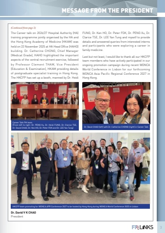MESSAGE FROM THE PRESIDENT3(Continued from page 2)Dr. David V K CHAOPresidentDr. David CHAO (left) with Dr. Catherine CHONG (right) in Career TalkCareer Talk FM team(From left to right: Dr. PENG Xu, Dr. Heidi FUNG, Dr. Clarice TSE, Dr. David CHAO, Dr. Ken HO, Dr. Peter FOK and Dr. LEE Yan Tung)HKCFP team promoting for WONCA APR Conference 2027 to be hosted by Hong Kong during WONCA World Conference 2025 in LisbonThe Career talk on 2026/27 Hospital Authority (HA) training programme jointly organised by the HA and the Hong Kong Academy of Medicine (HKAM) was held on 22 November 2025 at HA Head Office (HAHO) building. Dr. Catherine CHONG, Chief Manager (Medical Grade), HAHO highlighted the important aspects of the central recruitment exercise, followed by Professor Clement THAM, Vice President (Education & Examination), HKAM providing details of postgraduate specialist training in Hong Kong. The HKCFP has set up a booth, manned by Dr. Heidi FUNG, Dr. Ken HO, Dr. Peter FOK, Dr. PENG Xu, Dr. Clarice TSE, Dr. LEE Yan Tung and myself to provide details and answered queries from interested interns and participants who were exploring a career in family medicine.Last but not least, I would like to thank all our HKCFP team members who have actively participated in our ongoing promotion campaign during recent WONCA World Conference in Lisbon for our forthcoming WONCA Asia Pacific Regional Conference 2027 in Hong Kong.