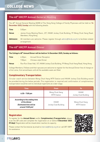 4COLLEGE NEWSThe 48th HKCFP Annual General MeetingThe 48th HKCFP Annual DinnerThe 48th Annual General Meeting (AGM) of The Hong Kong College of Family Physicians will be held on 14 December 2025, Sunday with the following details.Time:5:00pmVenue:James Kung Meeting Room, 2/F, HKAM Jockey Club Building, 99 Wong Chuk Hang Road, Aberdeen, Hong KongAdmission:All members are welcome. Please register through admin@hkcfp.org.hk to facilitate related arrangement.The College%u2019s 48th Annual Dinner will be held on 14 December 2025, Sunday as follows:Time:6:30pmAnnual Dinner Reception7:00pmChinese-style DinnerVenue:Run Run Shaw Hall, 1/F, HKAM Jockey Club Building, 99 Wong Chuk Hang Road, Hong KongCollege Members, Fellows and their spouses are welcome to register for the Annual Dinner free of charge on a first come, first served basis until all the available seats are filled.Complimentary Transportation:Circular coach service between Wong Chuk Hang MTR Station and HKAM Jockey Club Building would be provided during the below periods. Pre-registration is required and confirmation of complimentary transportation would be sent to individual registrants at a later stage.RegistrationTo register for the Annual Dinner and/or Complimentary Transportation, please scan the QR code and complete the registration on or before 5 December 2025 (Friday). Registration will be closed when reaches its capacity.Please contact the Secretariat, by email to internal@hkcfp.org.hk or call 2871 8899 for assistance.TimeFromTo6:30 %u2013 7:00 pmWong Chuk Hang MTR StationHKAM Jockey Club BuildingAccording to the ending time of the dinner(Estimated time will be around 10:00 pm)HKAM Jockey Club BuildingWong Chuk Hang MTR Station