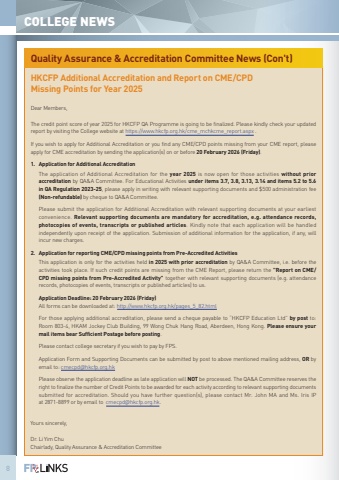 8COLLEGE NEWSDear Members,The credit point score of year 2025 for HKCFP QA Programme is going to be finalized. Please kindly check your updated report by visiting the College website at https://www.hkcfp.org.hk/cme_mchkcme_report.aspx . If you wish to apply for Additional Accreditation or you find any CME/CPD points missing from your CME report, please apply for CME accreditation by sending the application(s) on or before 20 February 2026 (Friday)1.Application for Additional AccreditationThe application of Additional Accreditation for the year 2025 is now open for those activities without prior accreditation by QA&A Committee. For Educational Activities under items 3.7, 3.8, 3.13, 3.14 and items 5.2 to 5.6 in QA Regulation 2023-25, please apply in writing with relevant supporting documents and $500 administration fee (Non-refundable) by cheque to QA&A Committee. Please submit the application for Additional Accreditation with relevant supporting documents at your earliest convenience. Relevant supporting documents are mandatory for accreditation, e.g. attendance records, photocopies of events, transcripts or published articles. Kindly note that each application will be handled independently upon receipt of the application. Submission of additional information for the application, if any, will incur new charges.2.Application for reporting CME/CPD missing points from Pre-Accredited ActivitiesThis application is only for the activities held in 2025 with prior accreditation by QA&A Committee, i.e. before the activities took place. If such credit points are missing from the CME Report, please return the \rt on CME/CPD missing points from Pre-Accredited Activity\tendance records, photocopies of events, transcripts or published articles) to us. Application Deadline: 20 February 2026 (Friday)All forms can be downloaded at: http://www.hkcfp.org.hk/pages_5_82.htmlFor those applying additional accreditation, please send a cheque payable to %u201cHKCFP Education Ltd%u201d by post to: Room 803-4, HKAM Jockey Club Building, 99 Wong Chuk Hang Road, Aberdeen, Hong Kong. Please ensure your mail items bear Sufficient Postage before postingPlease contact college secretary if you wish to pay by FPS.Application Form and Supporting Documents can be submitted by post to above mentioned mailing address, OR by email to: cmecpd@hkcfp.org.hkPlease observe the application deadline as late application will NOT be processed. The QA&A Committee reserves the right to finalize the number of Credit Points to be awarded for each activity according to relevant supporting documents submitted for accreditation. Should you have further question(s), please contact Mr. John MA and Ms. Iris IP at 2871-8899 or by email to cmecpd@hkcfp.org.hk.Yours sincerely,Dr. Li Yim ChuChairlady, Quality Assurance & Accreditation CommitteeHKCFP Additional Accreditation and Report on CME/CPD Missing Points for Year 2025Quality Assurance & Accreditation Committee News (Con't)
